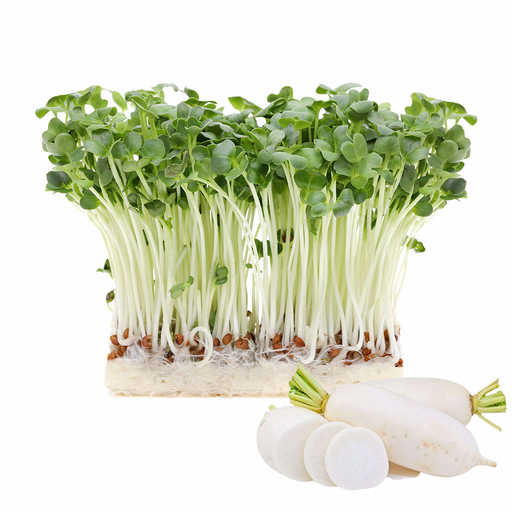 Radish White Stem microgreens and sprouts offer a mild yet peppery flavor with crunchy stems and vibrant green leaves.